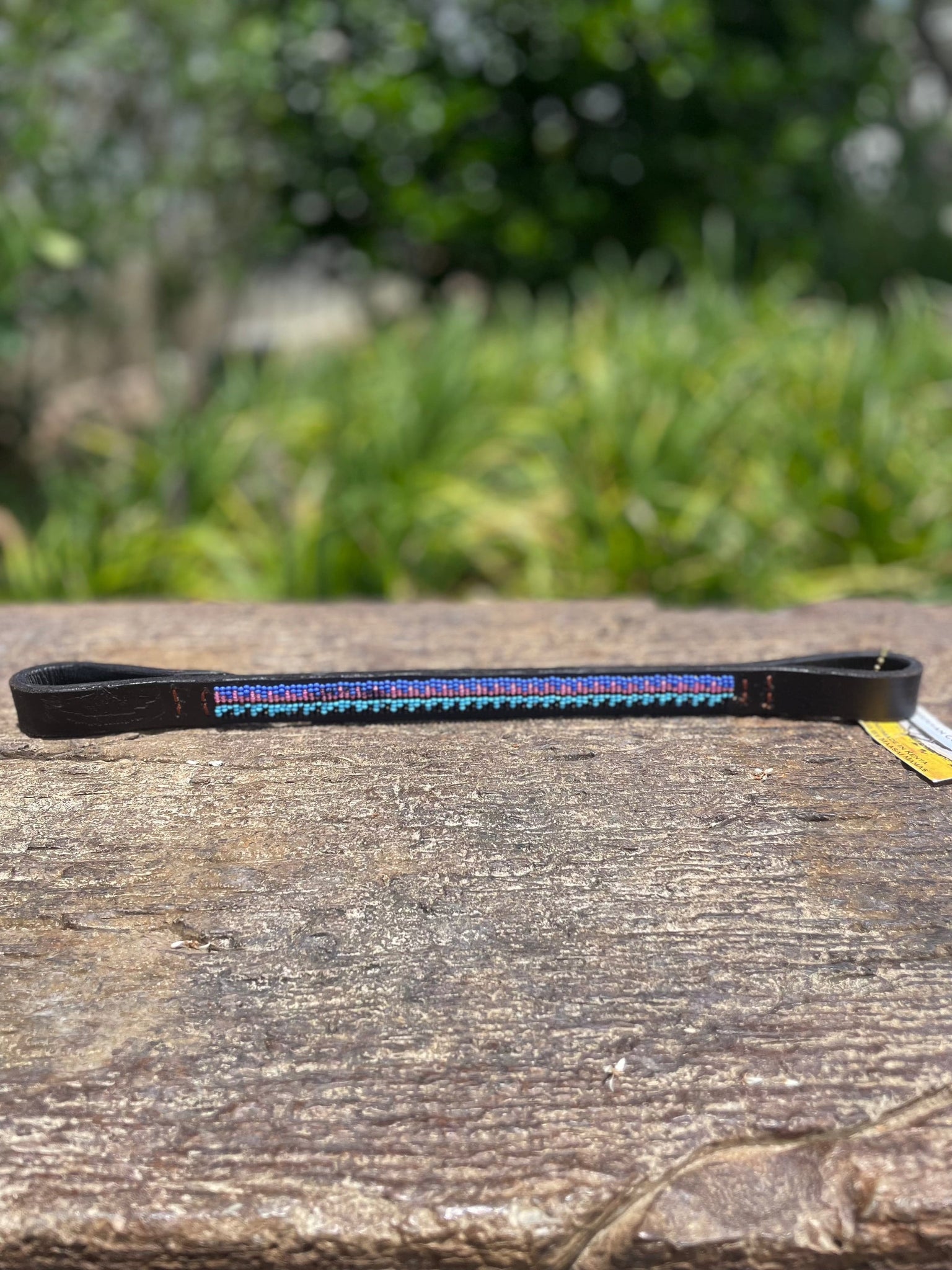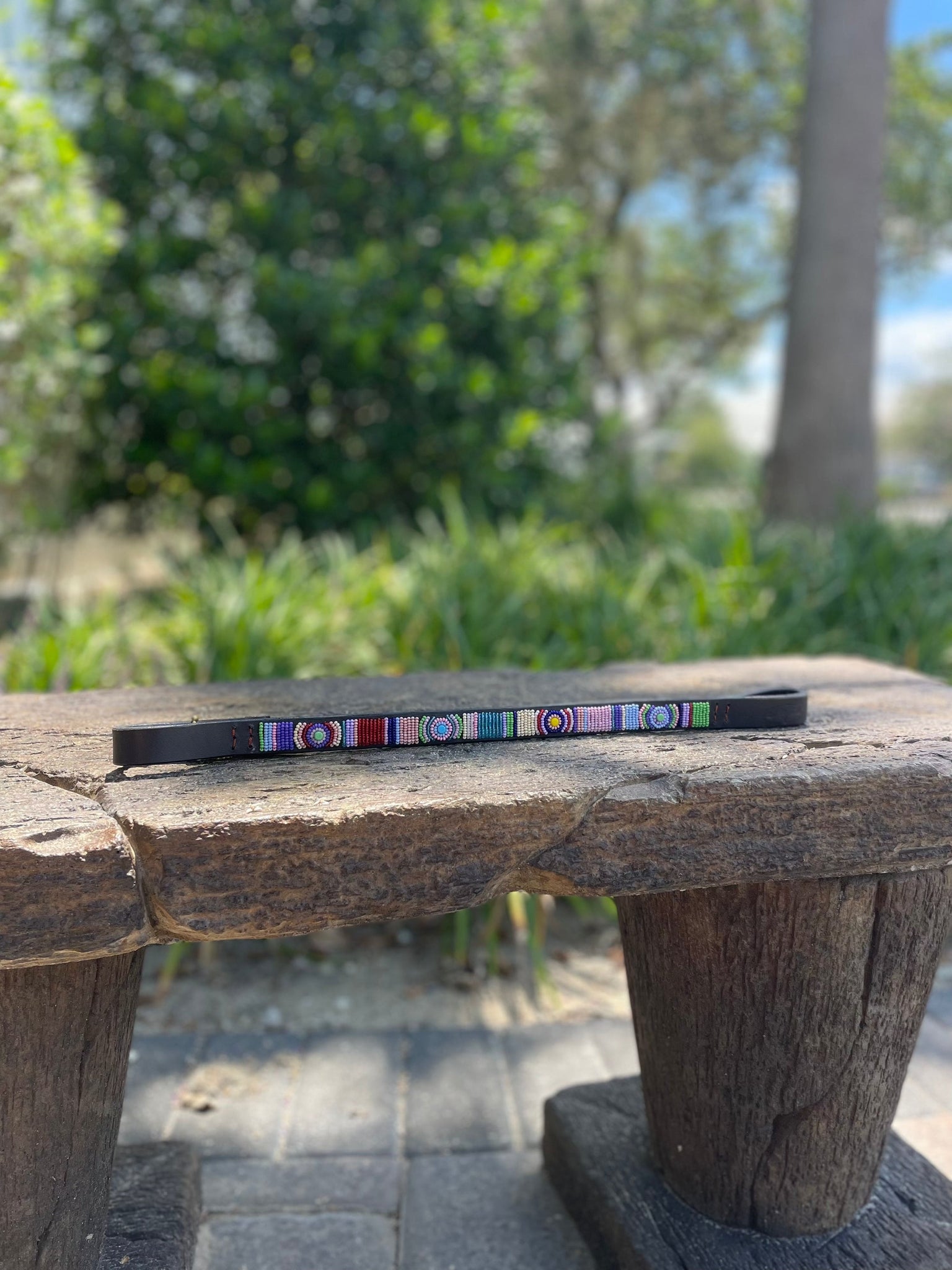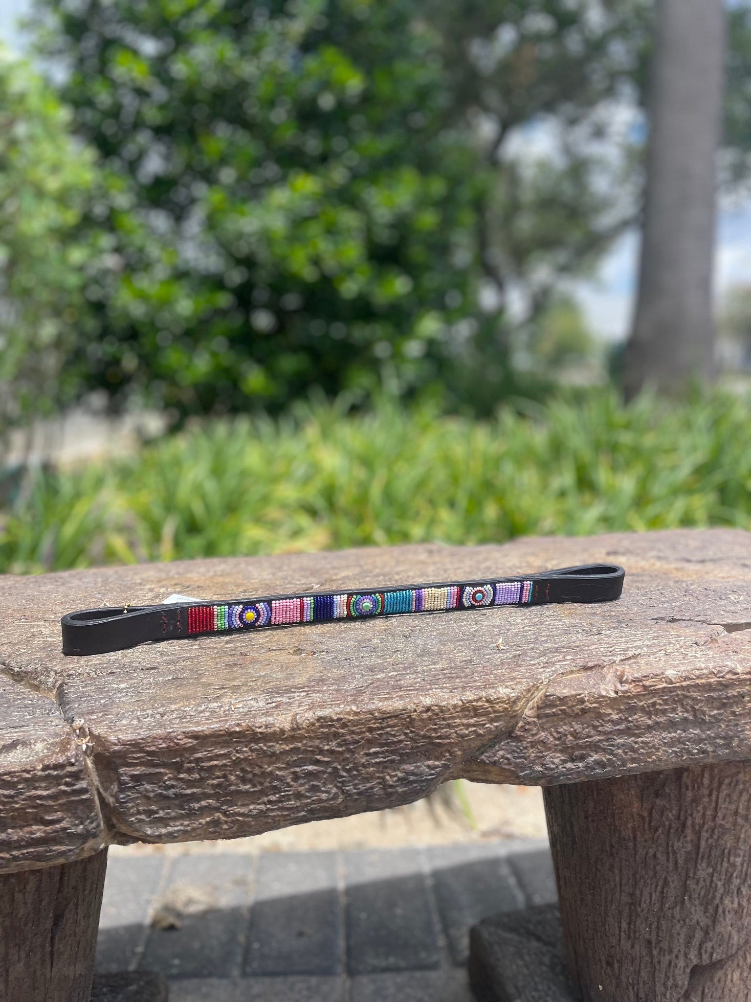 Introducing our exquisite hand-beaded browbands, meticulously crafted by the talented mamas of the Maasai Tribe on durable brown leather. Available in sizes ranging from 14 to 17 inches, these browbands are the epitome of artisanal craftsmanship.